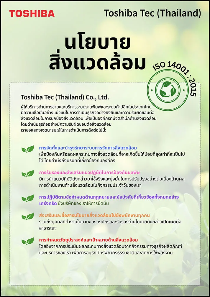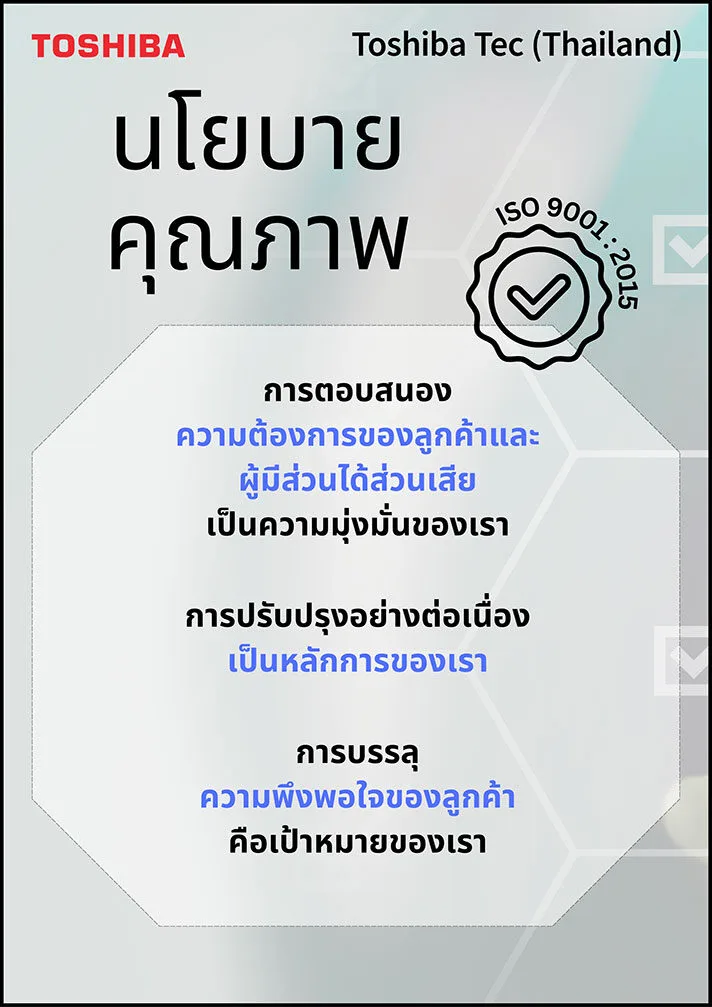Toshiba Tec Thailand ได้รับการยอมรับในความมุ่งมั่นด้านคุณภาพ สิ่งแวดล้อม และมาตรฐานการดำเนินงานระดับสากล ซึ่งสะท้อนถึงความทุ่มเทในการดำเนินธุรกิจอย่างมีความรับผิดชอบและยั่งยืนทั่วทั้งภูมิภาค