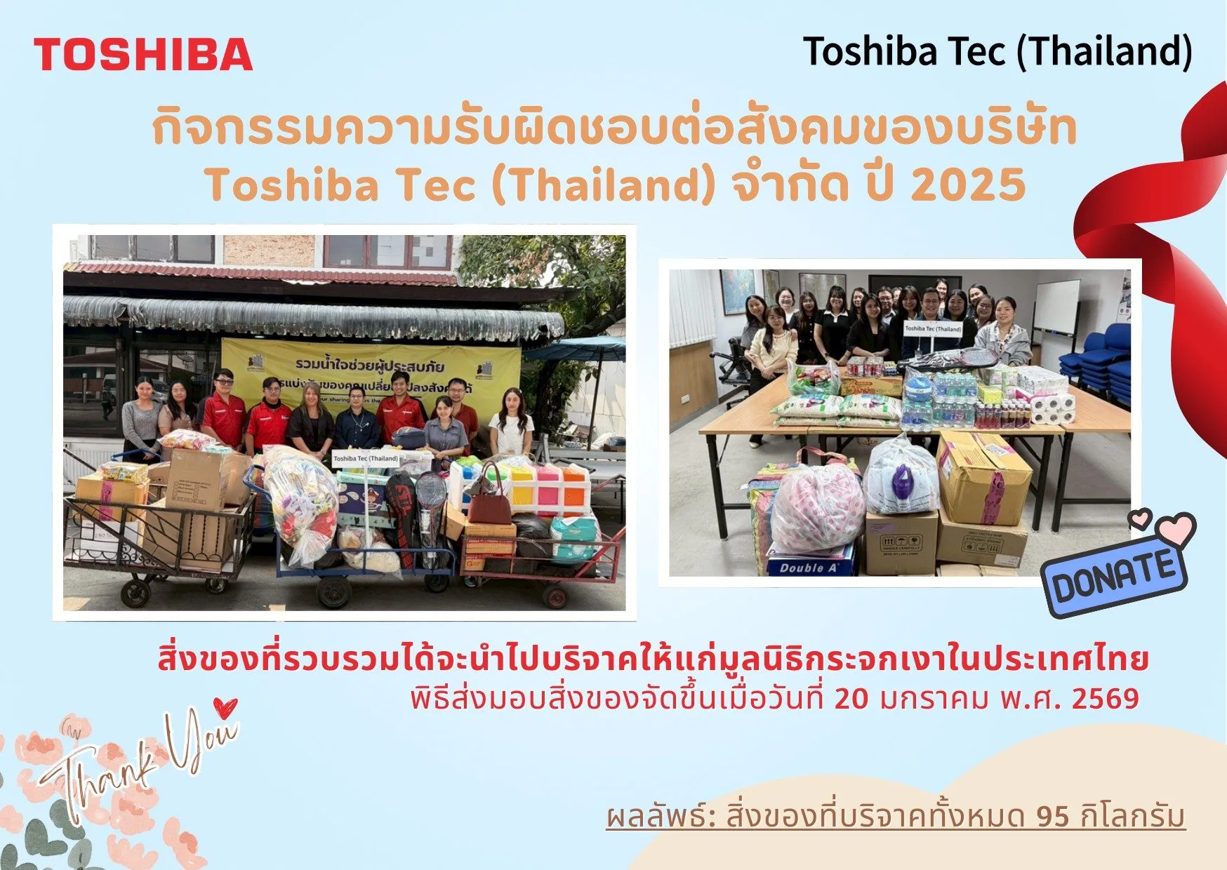 Toshiba Tec (Thailand) Co., Ltd. มีความยินดีที่จะประกาศความสำเร็จในการดำเนินโครงการบริจาคเพื่อสนับสนุน